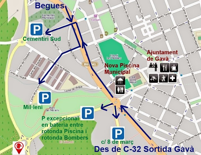Trobareu 3 aparcaments senyalitzats: Carrer 8 de març, Parc del Mil·leni i carretera de la Sentiu (de l'abocador). Els espais autoritzats per aparcar són relativament petits per la quantitat de participants que veniu amb cotxe, us recomanem que arribeu amb temps suficient per buscar-ne en cas de ser plens.